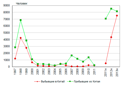 человек в 2011 году), и, особенно, число выбывших из России в Китай