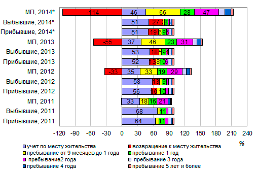 видам регистрации и срокам пребывания, 2011-2014* годы, %