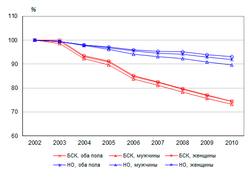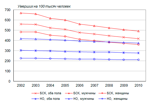 (с 562 умерших на 100 тысяч человек в 2002 году до 418 в 2010 году).