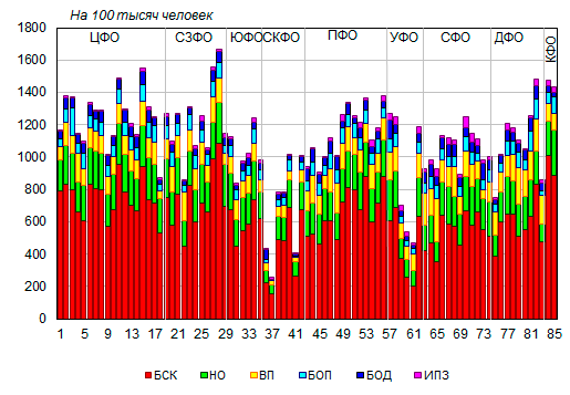 области (58 на 100 тысяч человек), Республике Тыве (51), Свердловской