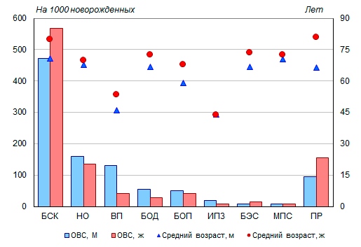 на 1000 новорожденных) и средний возраст смерти (лет) от основных