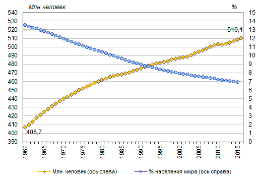 союза (ЕС-28), на начало 1960-2016 годов, миллионов человек и %