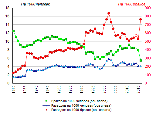 в России на 1000 человек постоянного населения, и соотношение разводов