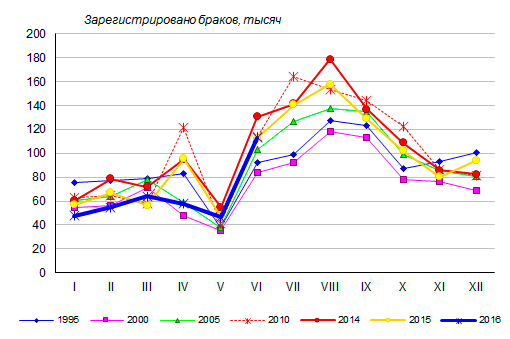 Относительно реже стали регистрироваться браки в декабре и апреле,