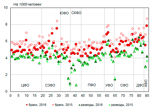 округе число зарегистрированных браков снизилось на 15,7% (6,8 против