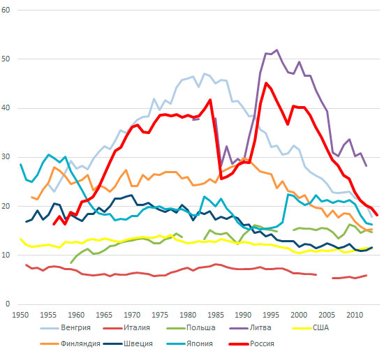 от самоубийств в России и некоторых странах мира, 1950-2014 годы