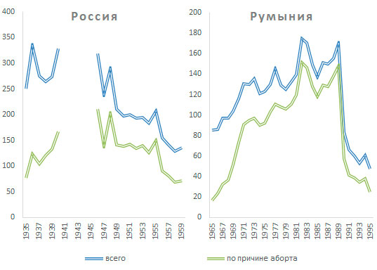 по причине аборта в городах России в 1935-1959 гг. и в Румынии в