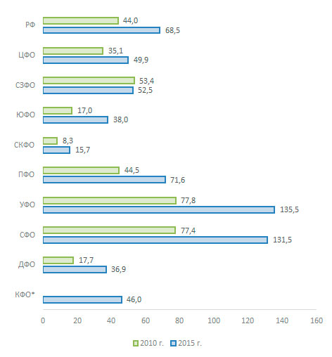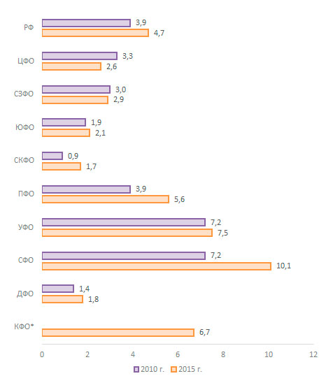 с 2010 по 2015 год вырос в шести федеральных округах, тогда как
