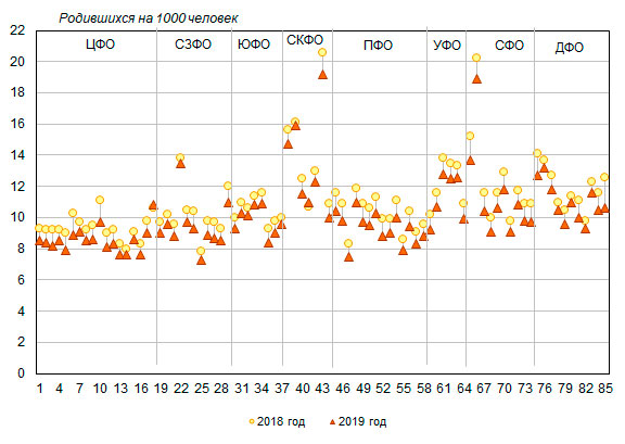 до 19,2‰ в Чеченской Республике (в 2018 году – от 7,8‰ до 20,6‰
