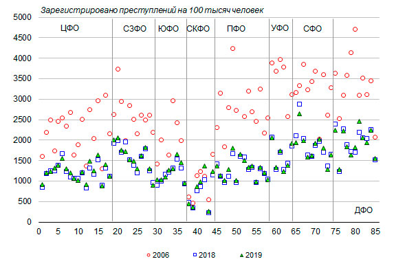 2006, 2018 и 2019 годы, зарегистрировано преступлений на 100 тысяч