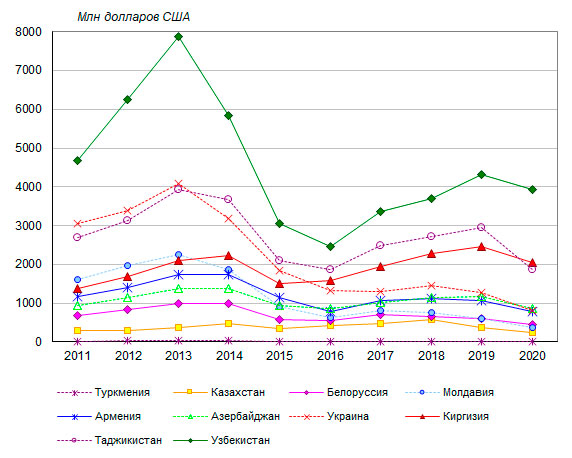 остаются Узбекистан (3921 миллион долларов США за 2020 год), Киргизия