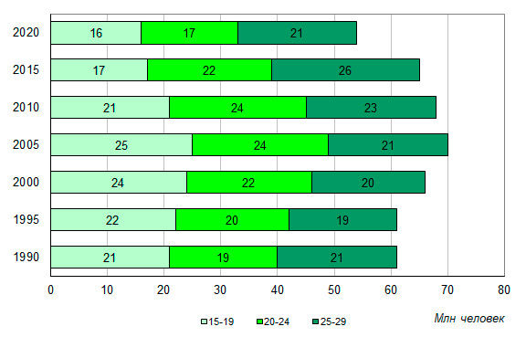 на 9 миллионов человек. В результате, если в 2005 году доля молодежи