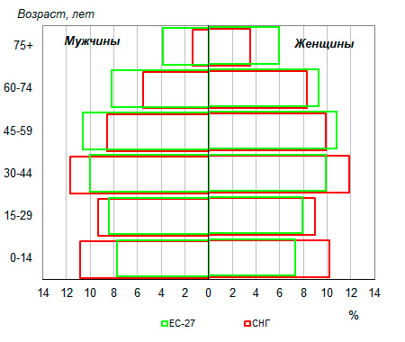 Если сравнить возрастно-половые пирамиды населения СНГ