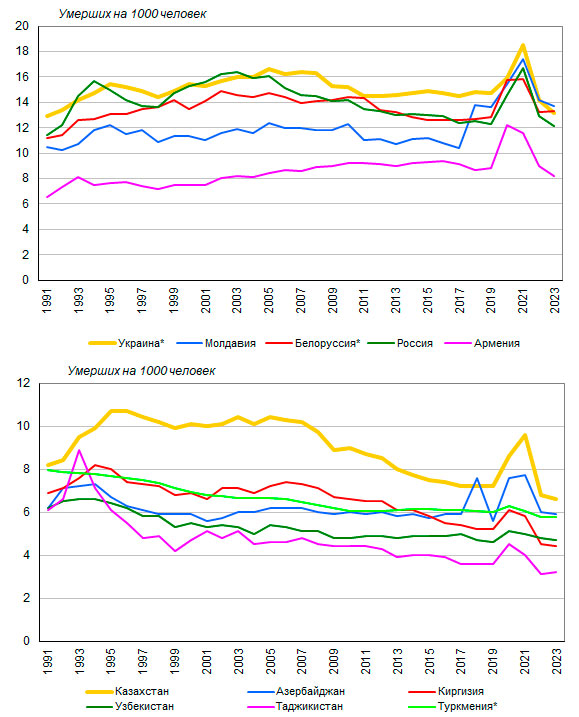 смертность в Таджикистане (около 25‰ по оценкам ООН) и Туркмении