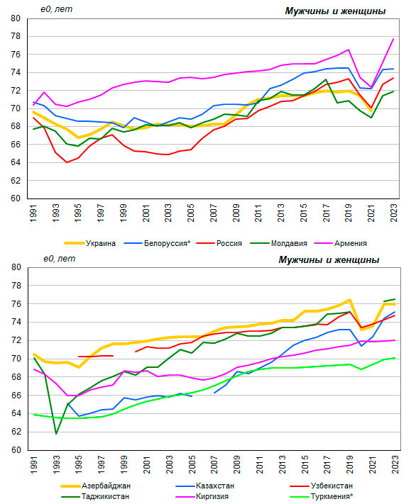 * Белоруссия, 2020-2023 годы, Туркмения, 1991-2023 годы – оценки