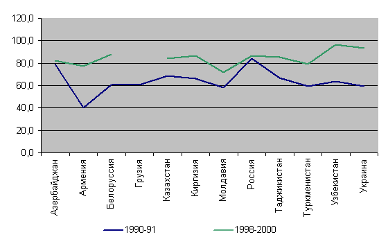СНГ в начале и конце 90-х годов приведены на рисунках 7 и 8.