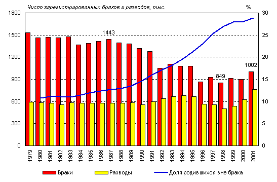 до 6,9 в 2001 году. Число регистрируемых браков имеет заметно выраженный