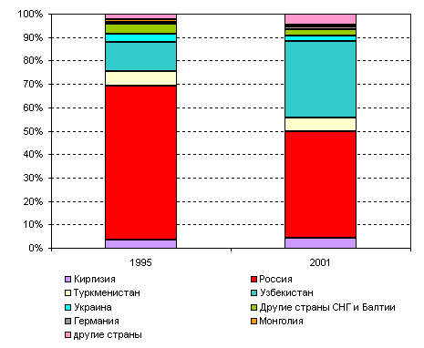 приходилось 78% всех прибывших в Казахстан в 2001 году (роль последнего как поставщика