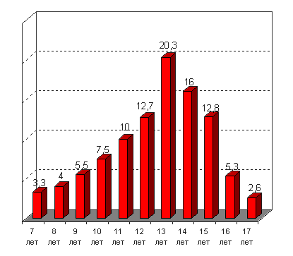 7-10 лет составляют примерно 20%, в возрасте 11-14 лет - 60%, старше