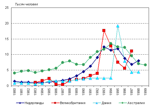 проживающие в некоторых западных странах, 1980, 1990, 1995 и 1998,