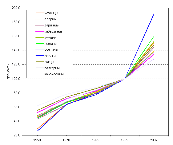по данным переписей 1959, 1970, 1979, 1989 и 2002 (1989 год = 100%)
