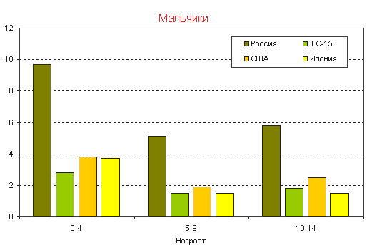 в России (2002), странах ЕС, США и Японии (1999), на 10000 мальчиков