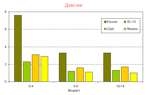 в России (2002), странах ЕС, США и Японии (1999), на 10000 девочек