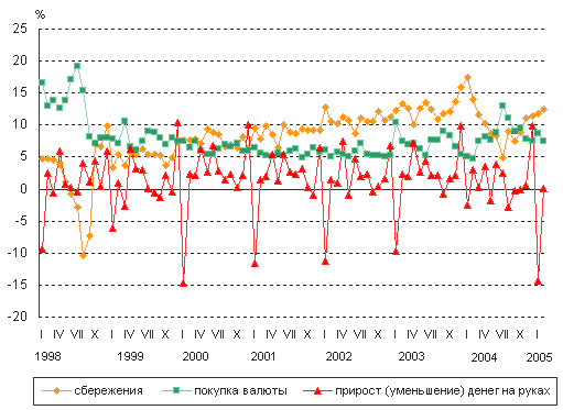 снизилось количество денег на руках (-14,4% в январе 2005 года против
