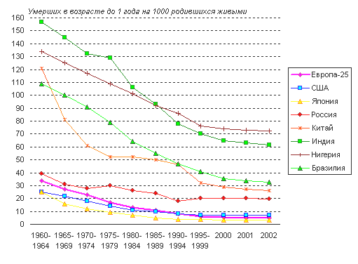 - с 33 до 8,7‰, в менее развитых странах она упала со 134 до 57,2‰.