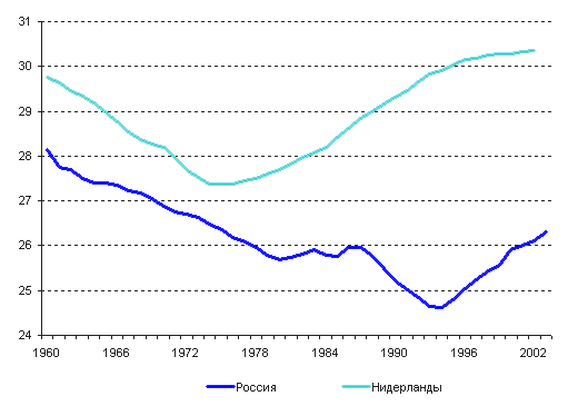 Рисунок 2. Доля внебрачных рождений в России и Нидерландах,