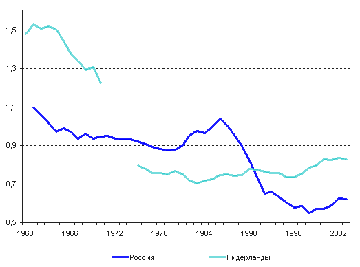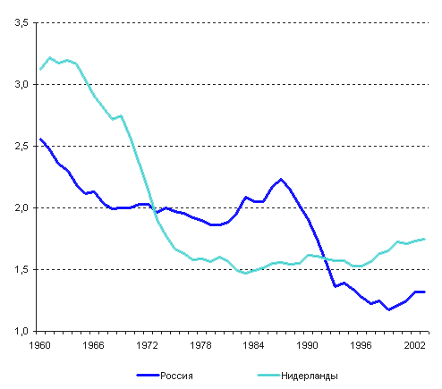 рождений на 1 женщину) в России и Нидерландах, 1960-2003
