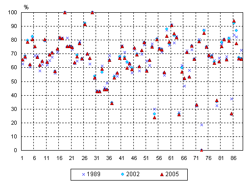 по сравнению с данными переписи 2002 года, в 42 регионах, наиболее