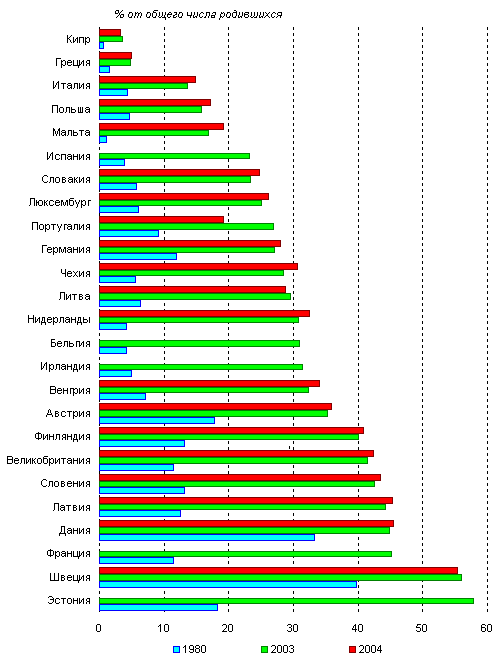 до 31,6% в 2004 году. Наиболее высок уровень внебрачной рождаемости