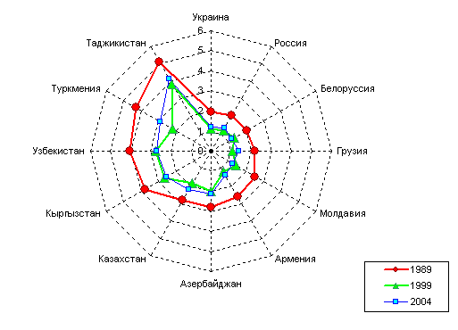 а менее всего - в 1,1 раза - в Таджикистане. К 2004 году эта тенденция