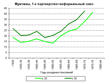 брак с первым партнером, в поколениях 1970-х годов рождения этот
