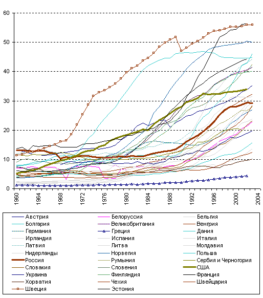 среднее положение в Европе. В Швеции и Эстонии она превысила 55%,