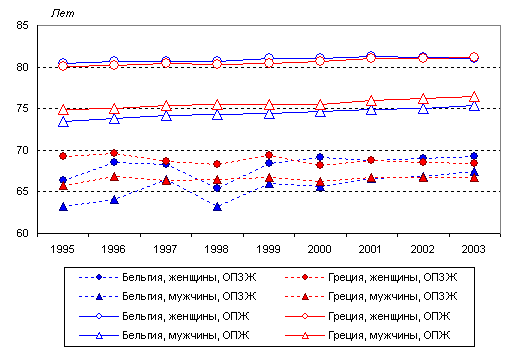 мужчин и женщин в Бельгии и Греции, 1995-2003, лет