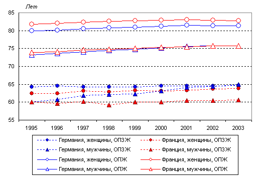 мужчин и женщин в Германии и Франции, 1995-2003, лет