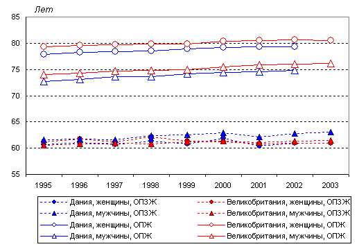 мужчин и женщин в Великобритании и Дании, 1995-2003, лет