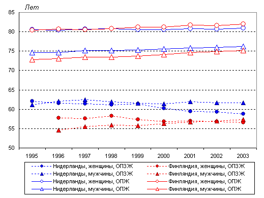 мужчин и женщин в Нидерландах и Финляндии, 1995-2003, лет