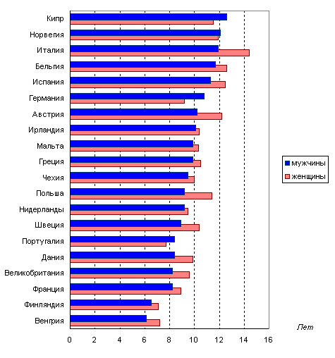 в Финляндии до 14,4 года в Италии, а для мужчин-сверстников - от