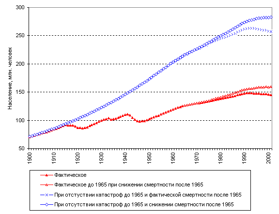 и кризиса смертности последней трети ХХ века. 1900-2000 годы, млн.человек