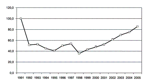 заработной платы в 1991-2005 годах (данные за декабрь), в % к 1991