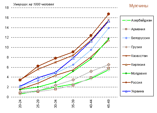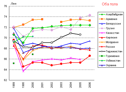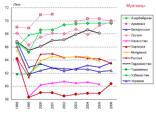 58,3 года в России до 68,9 года в Армении), а к 2001 году - до 12