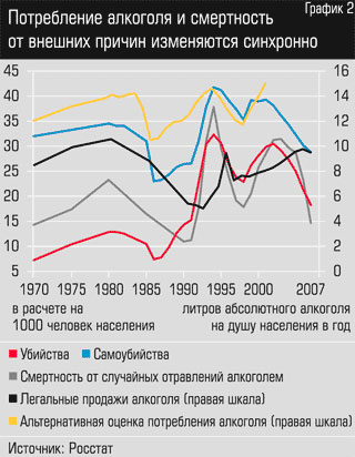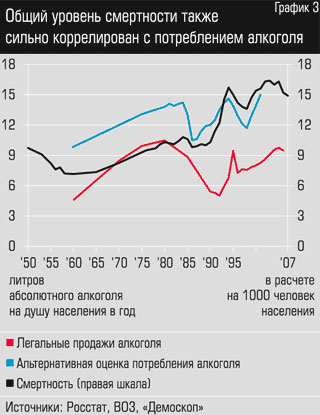 Однако, во-первых, есть периоды, когда рост потребления алкоголя сопровождался не подъемом, а снижением смертности — и общей, и от внешних причин, например в 2002–2007 годах (см. графики 2 и 3). Аналогичная нестыковка и в 60?х годах: с 1960?го по 1970?й потребление алкоголя, по официальным оценкам, выросло с 4,6 до 8,5 л на душу (по неофициальным — с 9,8 до 12 л), а продолжительность жизни не изменилась — 69 лет в 1960?м, 70 — в 1965?м, 69 — в 1970 году. Во-вторых, сам уровень потребления алкоголя в 90?х был не выше, чем в начале 80?х, хотя уровень общей смертности и смертности от внешних причин был в полтора раза выше.