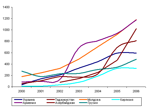 за период с 2000 по 2006 год объем денежных переводов за пределы