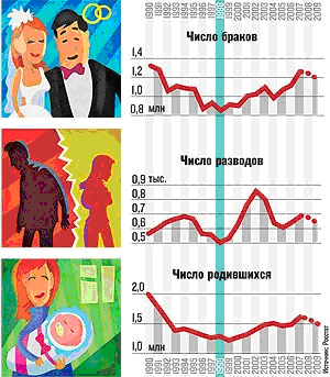 В трудные времена в России обычно избегают перемен в личной жизни. Это стало ясно еще 10 лет назад: в кризисном 1998 году Росстат зафиксировал резкое сокращение количества разводов и новых браков и падение рождаемости. Люди реже женятся, реже расстаются, меньше рожают, но и связи на стороне тоже заводят не так часто. Во время кризиса все стремятся сохранить статус-кво в своей частной жизни и добиться стабильности хотя бы на личном фронте. Социологи говорят, что это значит только одно: в кризисном 2009 году будет утеряно большинство демографических завоеваний последних лет.