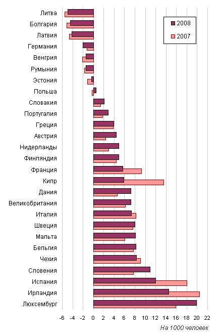 За 2008 год в 7 из 27 стран Европейского Союза население