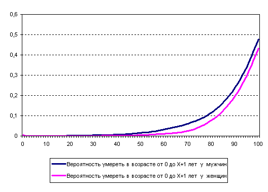 Вероятность умереть у мужчин во всех возрастах выше,