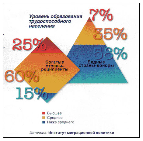 Если посмотреть на уровень образования в развитых странах, принимающих трудовых мигрантов, мы увидим форму, близкую к ромбу. Другая геометрическая фигура вырисовывается, если речь идет о странах-донорах. Здесь перед нами образовательная пирамида.